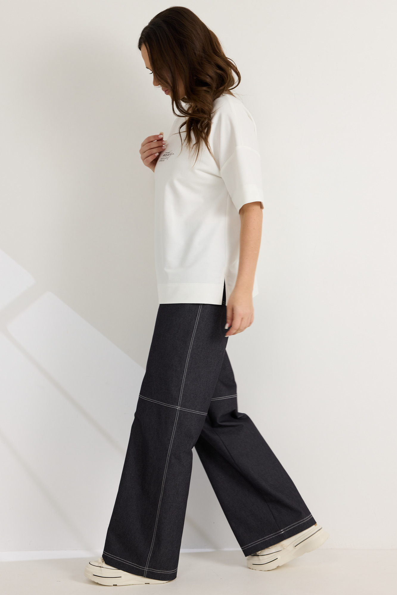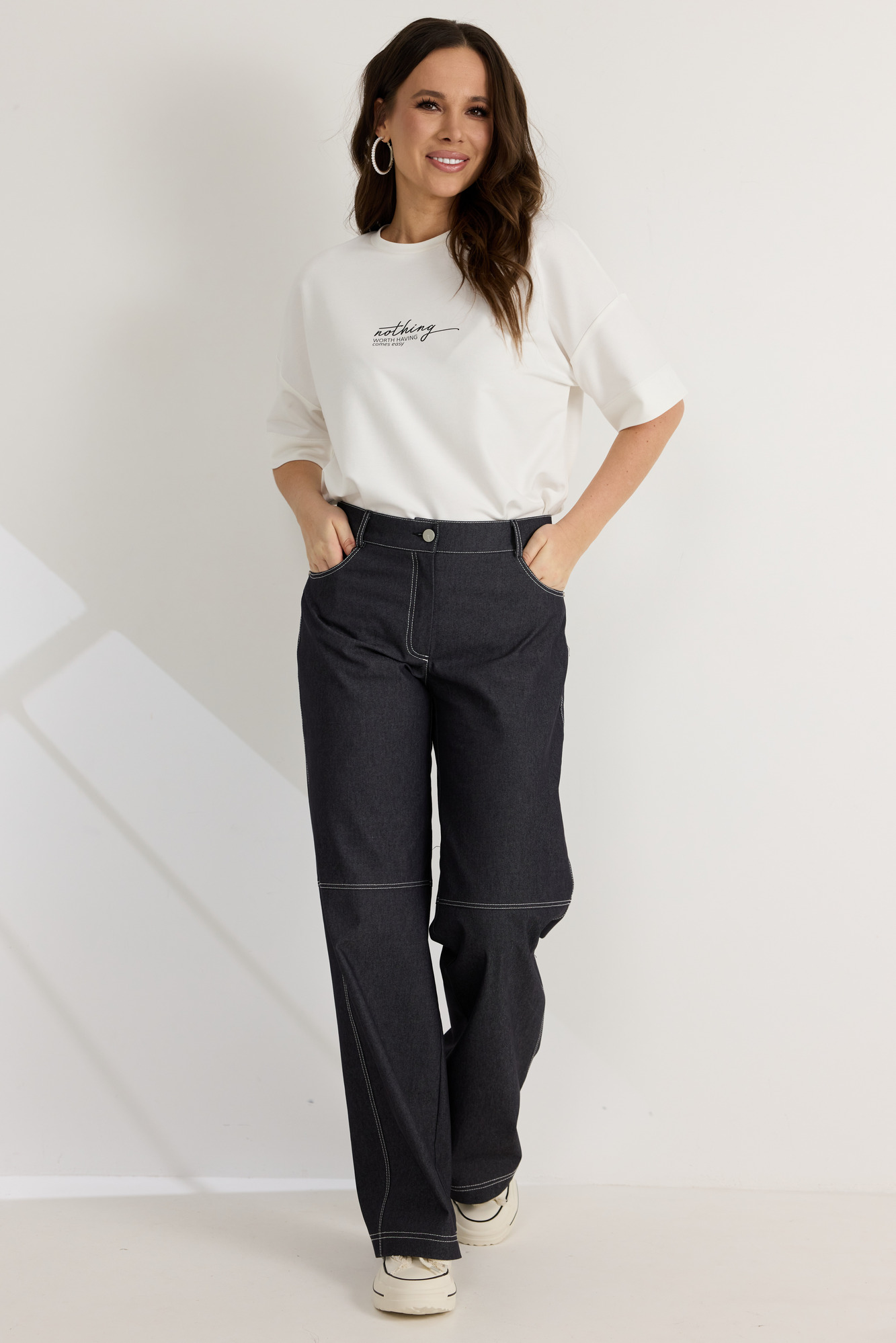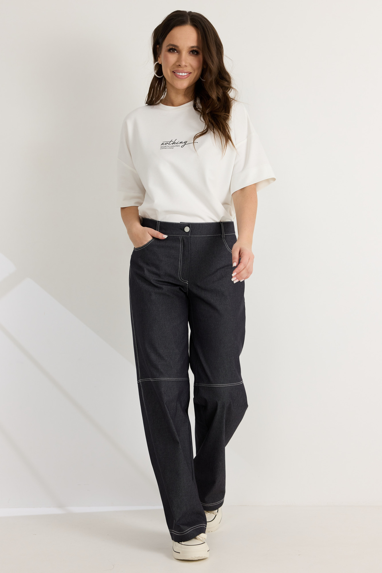 Брюки прямого свободного кроя. Выполнены из джинсового полотна средней плотности. Брюки дополнены декоративными строчками вдоль швов, а также металлическими заклепками. Пояс притачной, по спинке дополнен эластичной тесьмой. Спереди застежка гульфик с молнией и пуговицей. Брюки дополнены боковыми карманами, а также накладными карманами сзади. Длина брюк по боковому шву 107 см.