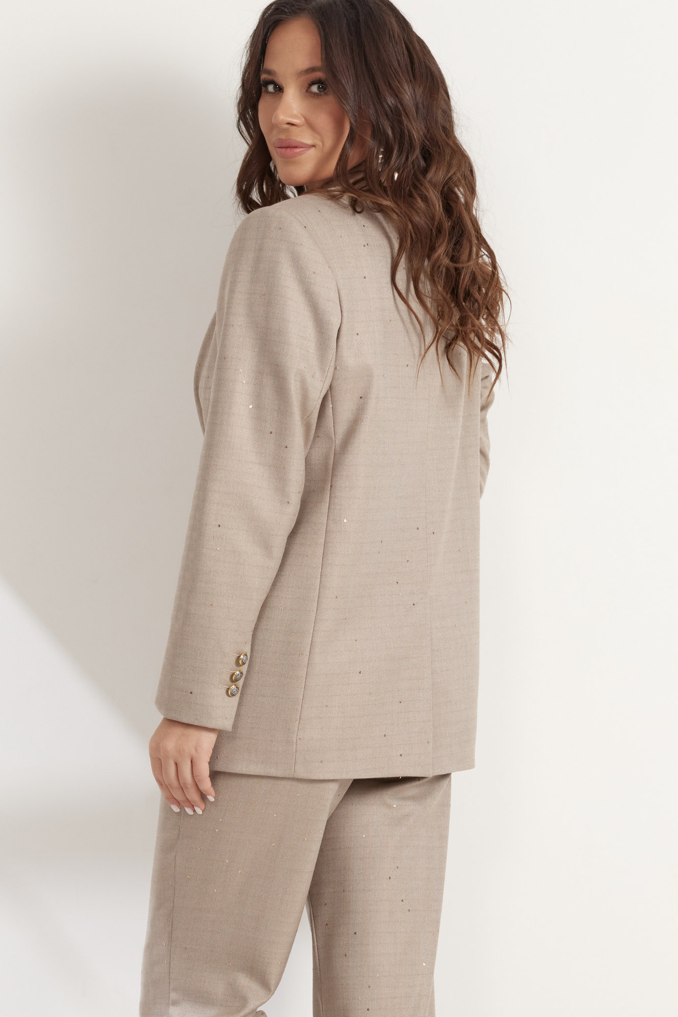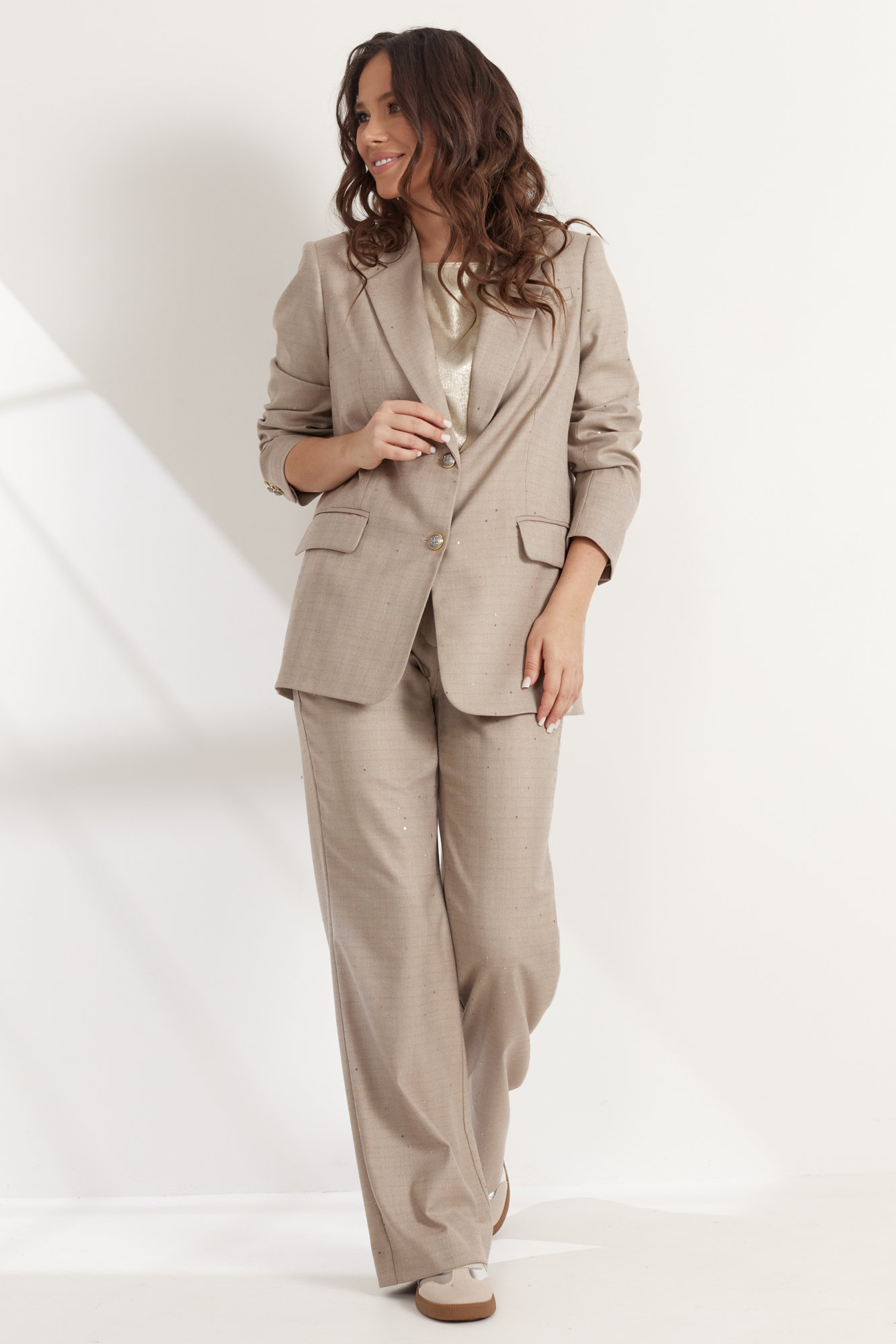 Элегантный костюм из жакета и брюк. Жакет прямого свободного кроя, на подкладке, с центральной застежкой на пуговицы. Дополнен функциональными карманами. Выполнен из костюмной ткани с россыпью мелких пришивных пайеток, создающих легкое мерцание. Брюки классического прямого кроя с притачным поясом, дополненным эластичной тесьмой. Дополнены удобными боковыми карманами. Застежка гульфик на молнию и пришивную пуговицу. Длина жакета от плечевого шва 73см. Длина рукава 60см. Длина брюк 109.