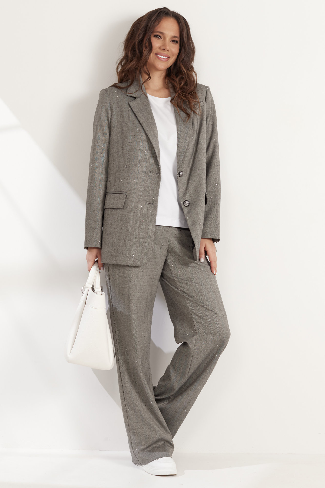 Элегантный костюм из жакета и брюк. Жакет прямого свободного кроя, на подкладке, с центральной застежкой на пуговицы. Дополнен функциональными карманами. Выполнен из костюмной ткани с россыпью мелких пришивных пайеток, создающих легкое мерцание. Брюки классического прямого кроя с притачным поясом, дополненным эластичной тесьмой. Дополнены удобными боковыми карманами. Застежка гульфик на молнию и пришивную пуговицу. Длина жакета от плечевого шва 73см. Длина рукава 60см. Длина брюк 109.