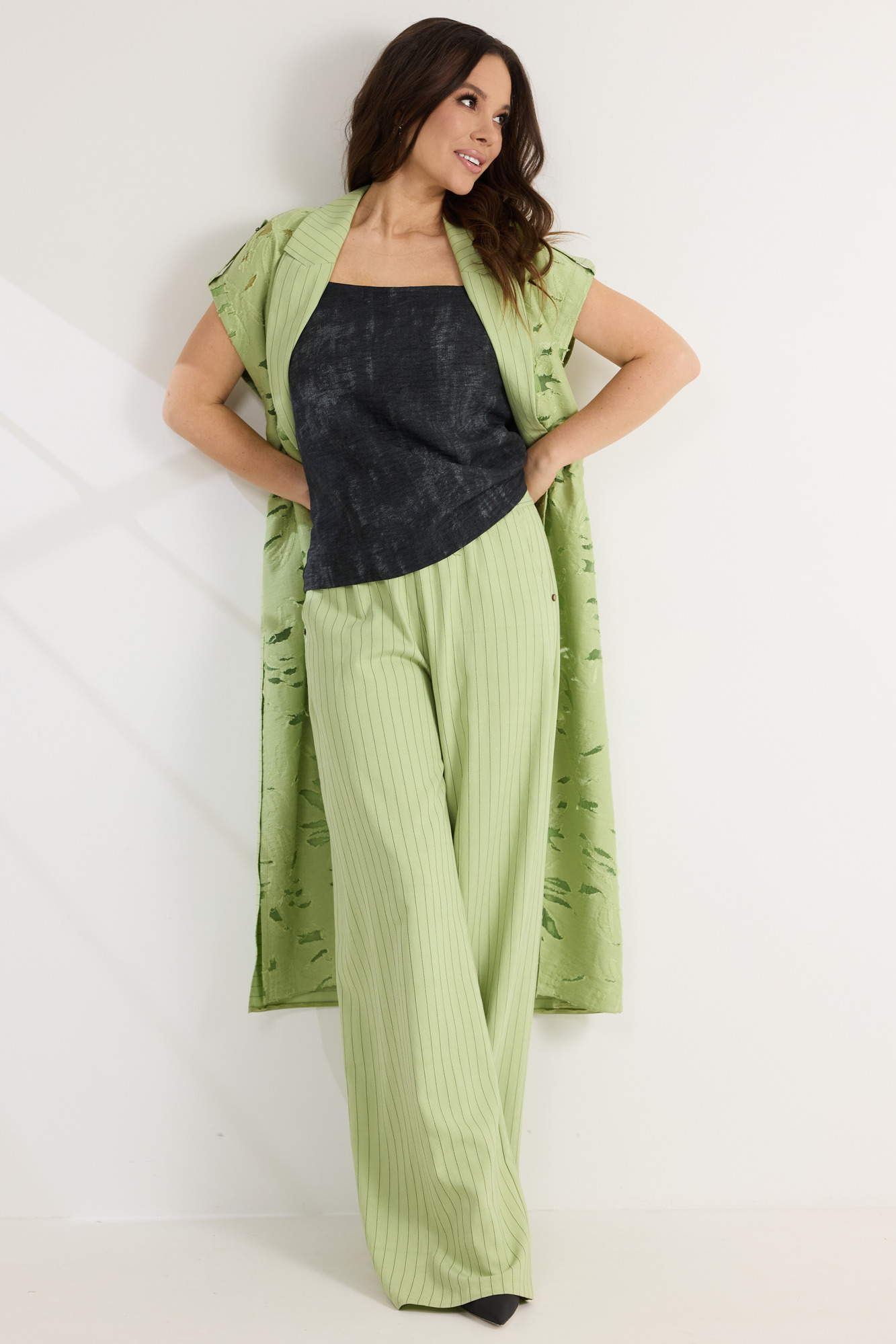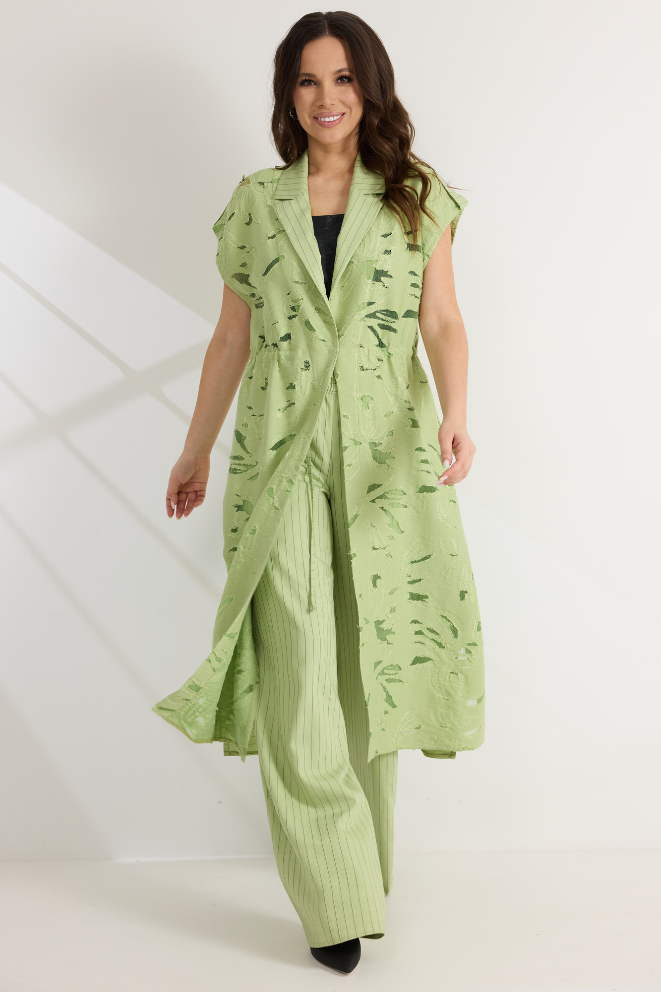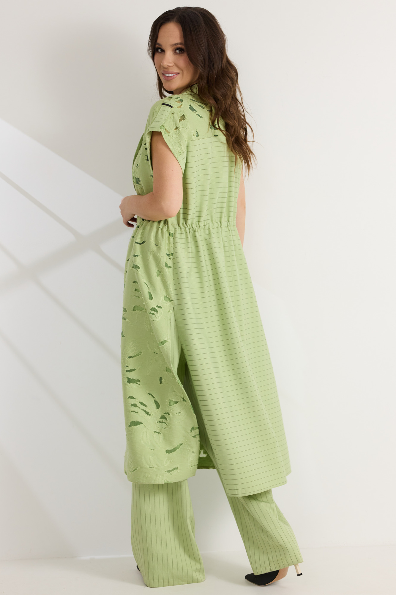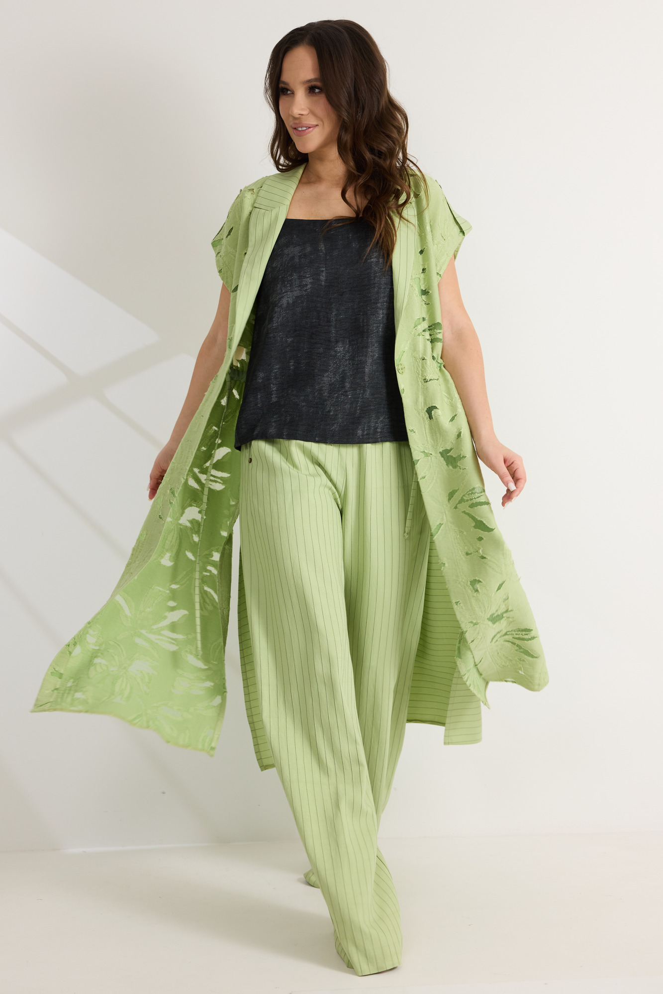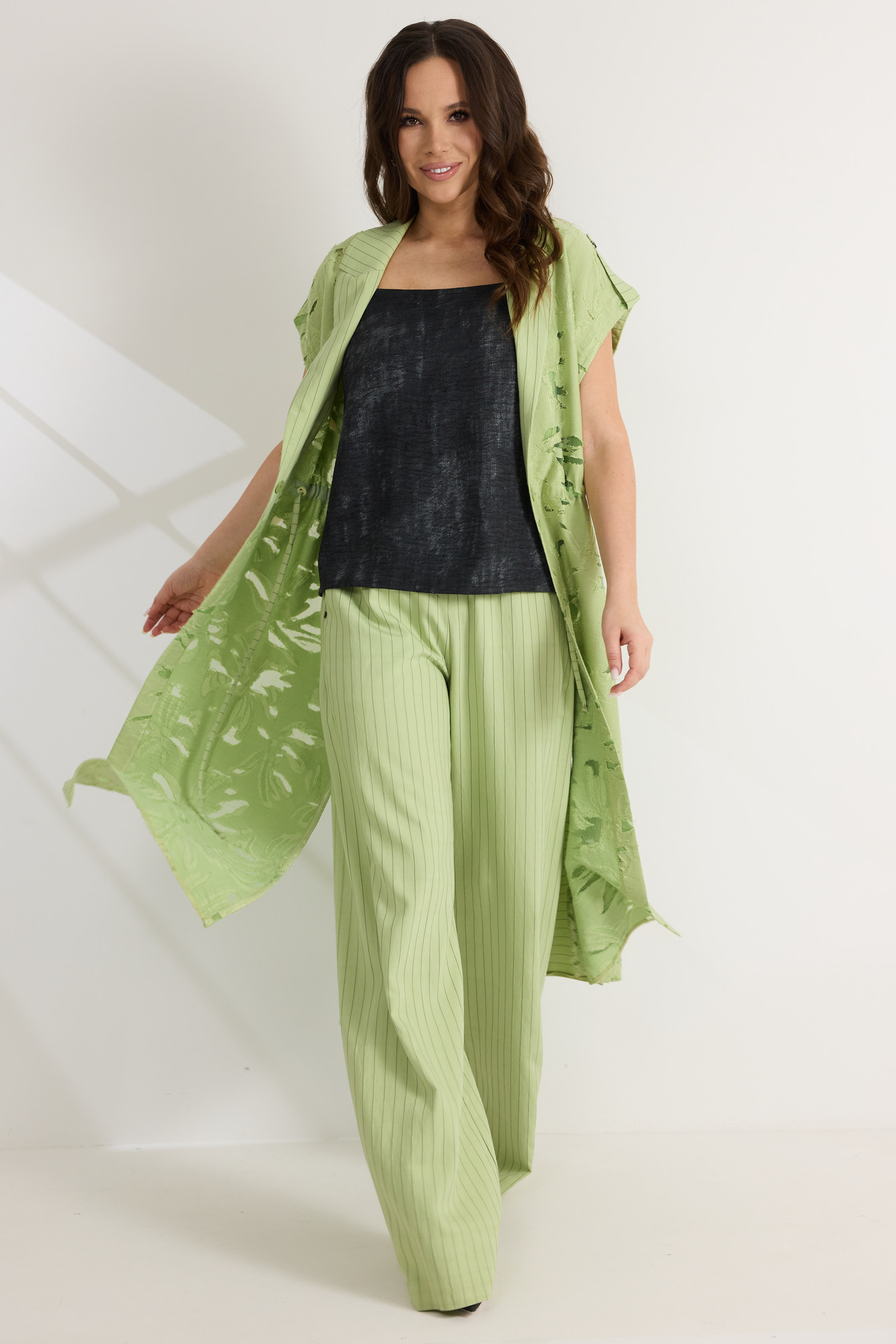 Элегантный комплект из кардигана топа и брюк. Удлиненный кардиган свободного кроя с коротким, цельнокроеным рукавом. По талии дополнен скрытой кулиской. Горловина обработана отложным воротником. Перед выполнен из натуральной вискозной ткани с вкраплениями из органзы, что придает кардигану легкость и воздушность. Спинка выполнена из поливискозного полотна цвета лайм в меловую полоску. Топ прямого кроя. Выполнен из вискозного полотна. Брюки прямого свободного кроя с притачным поясом, дополненным эластичной тесьмой. Застежка гульфик на молнию и пришивную пуговицу. Брюки дополнены боковыми карманами. Выполнены брюки из поливискозного полотна цвета лайм в меловую полоску. Длина кардигана от плечевого шва 128 см. Длина топа от плечевого шва 63см. Длина брюк по боковому шву 105см.