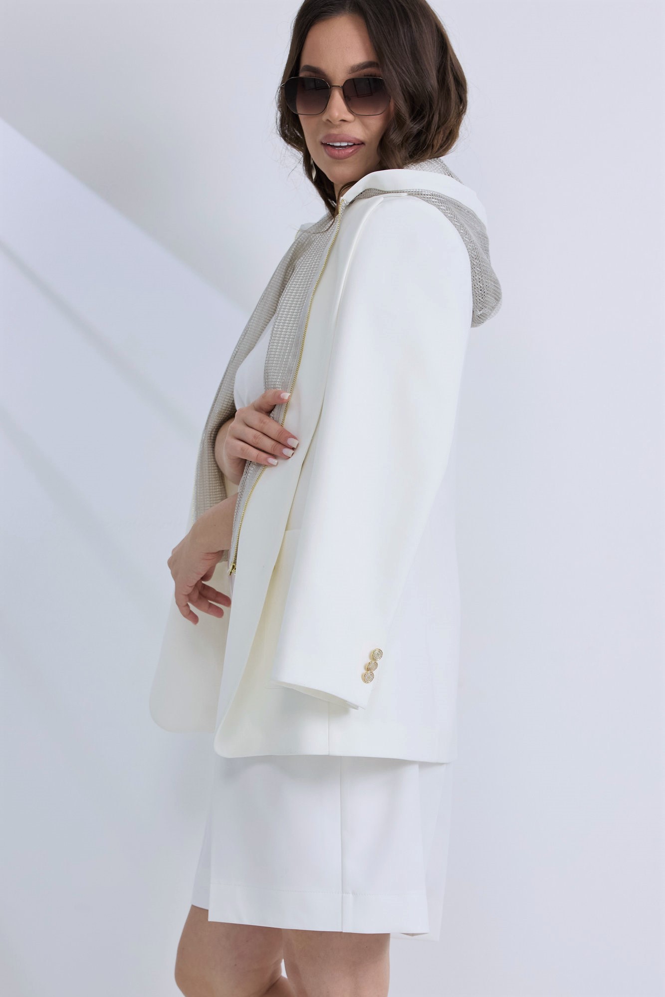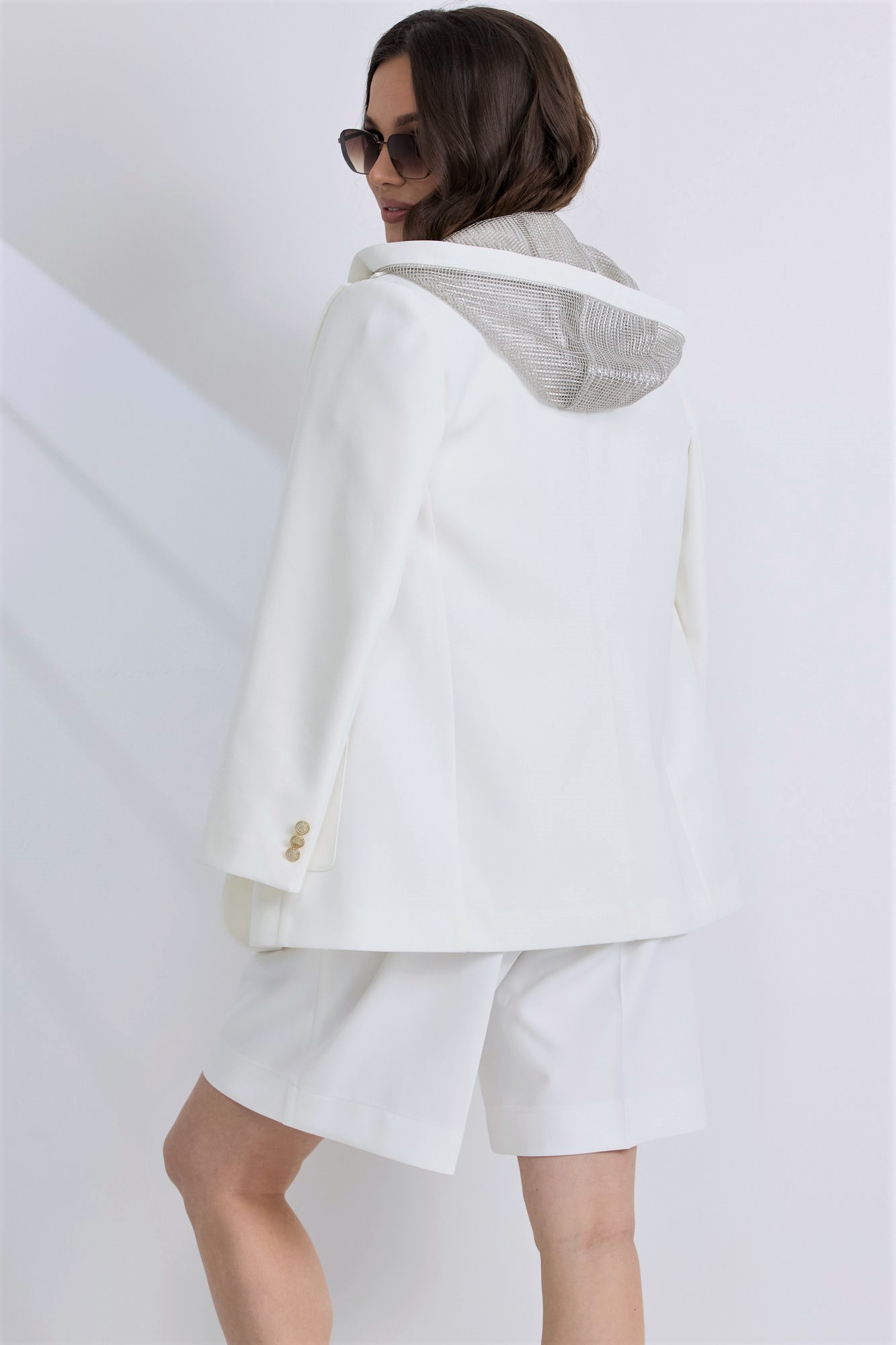Стильный комплект из жакета и шорт. Жакет прямого кроя , на подкладке, с центральной застежкой на пуговицы. Рукав втачной. Жакет дополнен накладными карманами. Изюминкой жакета является съемный элемент из текстильной сетки, представляющий собой манишку с капюшоном, с застежкой на молнию. Шорты свободного кроя с притачным поясом, дополненным эластичной тесьмой. Застежка гульфик на молнию и пуговицу. Шорты дополнены шлевками для ремня и удобными боковыми карманами. Длина жакета от плечевого шва 73см. Длина рукава 60см. Длина шорт по боковому шву 53см.
