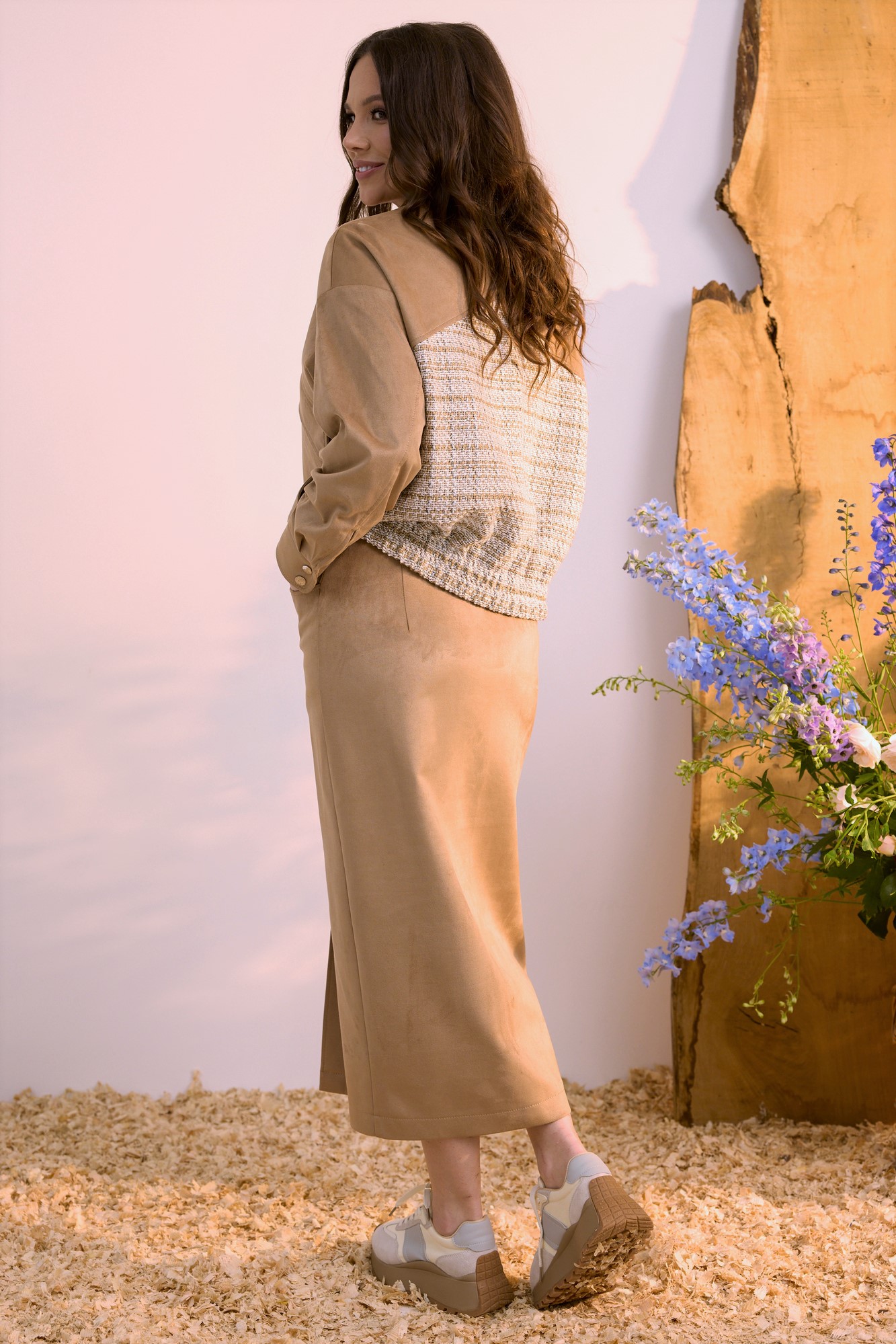 Стильный комплект из бомбера и юбки. Бомбер выполнен из текстильной замши в комбинации с рогожкой. Юбка выполнена из текстильной замши. Бомбер свободного кроя, на подкладке, с центральной застежкой на молнию. Воротник отложной Рукав со спущенной линией плеча. Дополнен притачной манжетой с застежкой на металлические кнопки. Низ слегка присборен на эластичную тесьму. Оригинальная форма карманов придает образу неповторимый стиль. Юбка миди , слегка заужена к низу. Дополнена притачным поясом с эластичной тесьмой и застежкой гульфик на молнии и пуговицу. Спереди расположен разрез. Так же юбка дополнена удобными боковыми карманами. Длина бомбера от плечевого шва 64см. Длина рукава 60см. Длина юбки по боковому шву 83см.