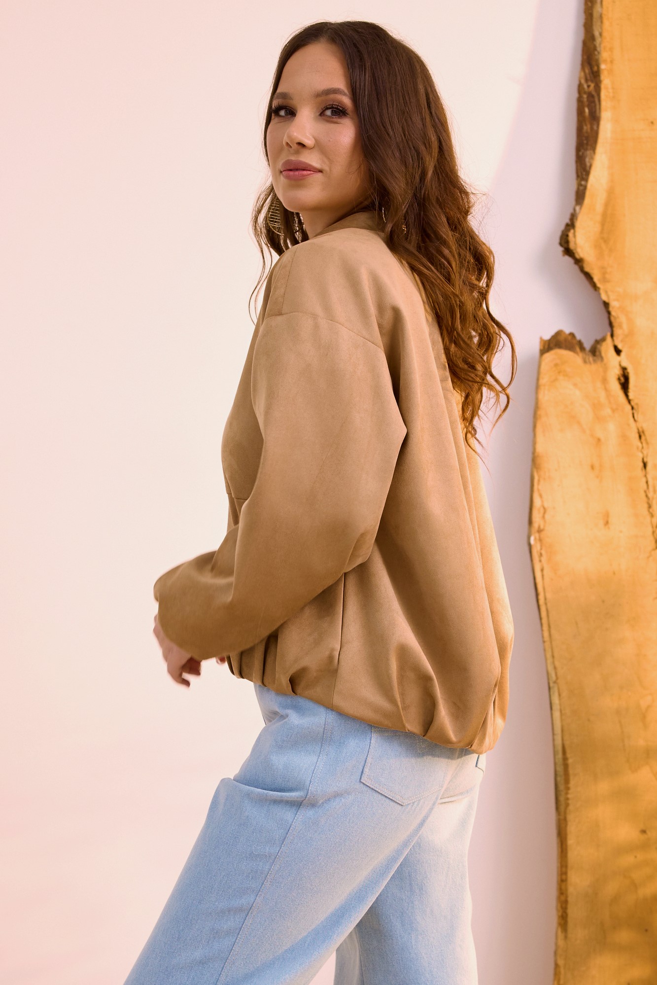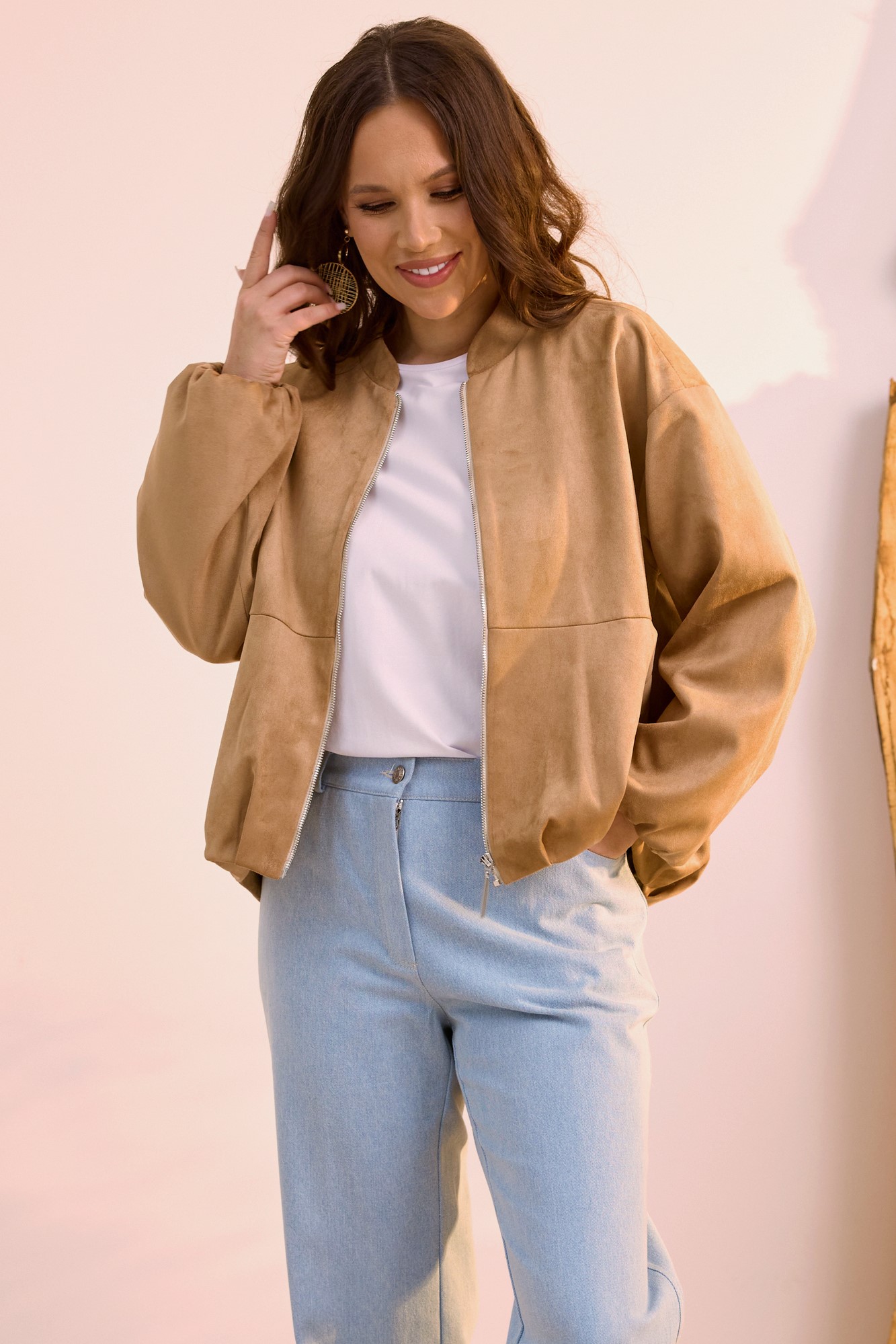 Стильная замшевая куртка в ТОПовом оттенке, которая так популярна в этом сезоне. Выполнена из текстильной замши премиум качества на подкладке без утеплителя. Можно использовать как бомбер и носить под верхнюю одежду. Куртка с центральной застежкой на металлическую молнию. Горловина обработана стойкой. Рукав втачной, слегка спущен. Перед куртки короче спинки. Куртка дополнена боковыми карманами. Длина куртки от плечевого шва по переду 60см., по спинке 66см. Длина рукава 61см.