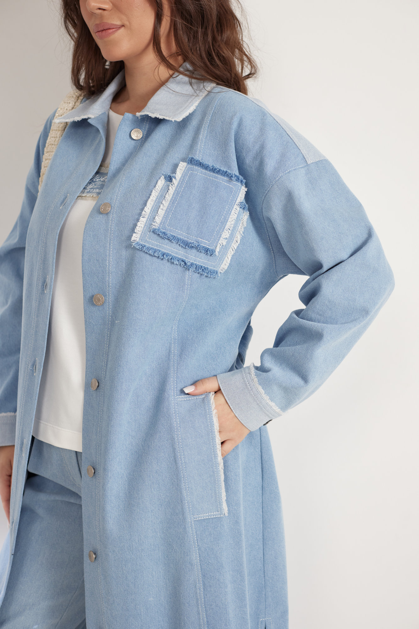 Стильных и универсальный предмет гардероба — джинсовый плащ (тренч) свободного кроя , без подкладки, с центральной застежкой на металлические пуговицы. Выполнен из качественного джинсового полотна. Плащ дополнен съемным поясом, выполненным из основной ткани, а так же удобными боковыми карманами. Рукав спущен. Длина плаща от плечевого шва 124см Длина рукава 60см.