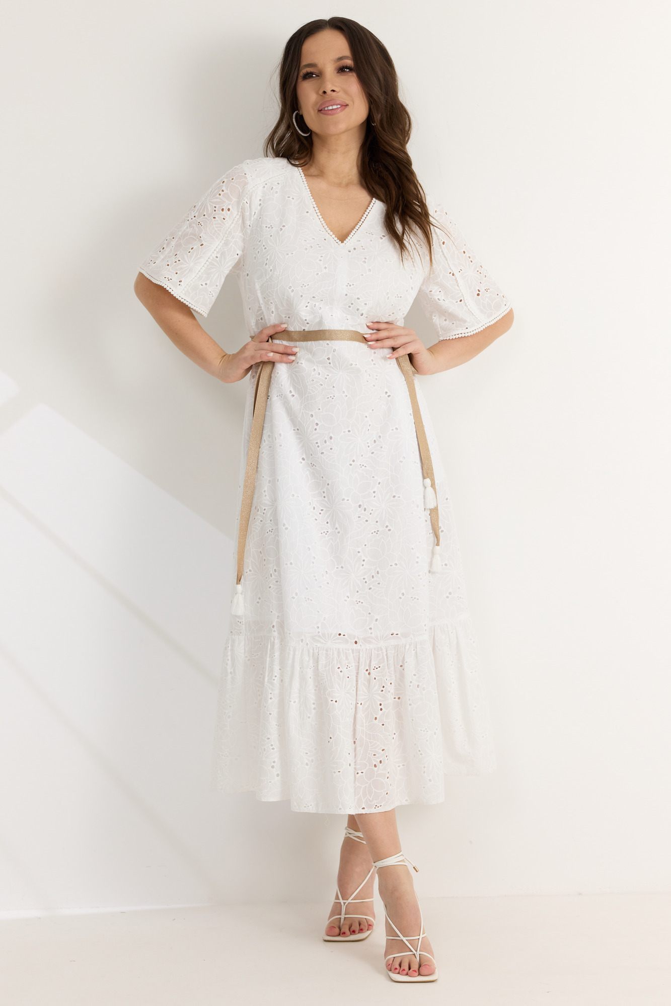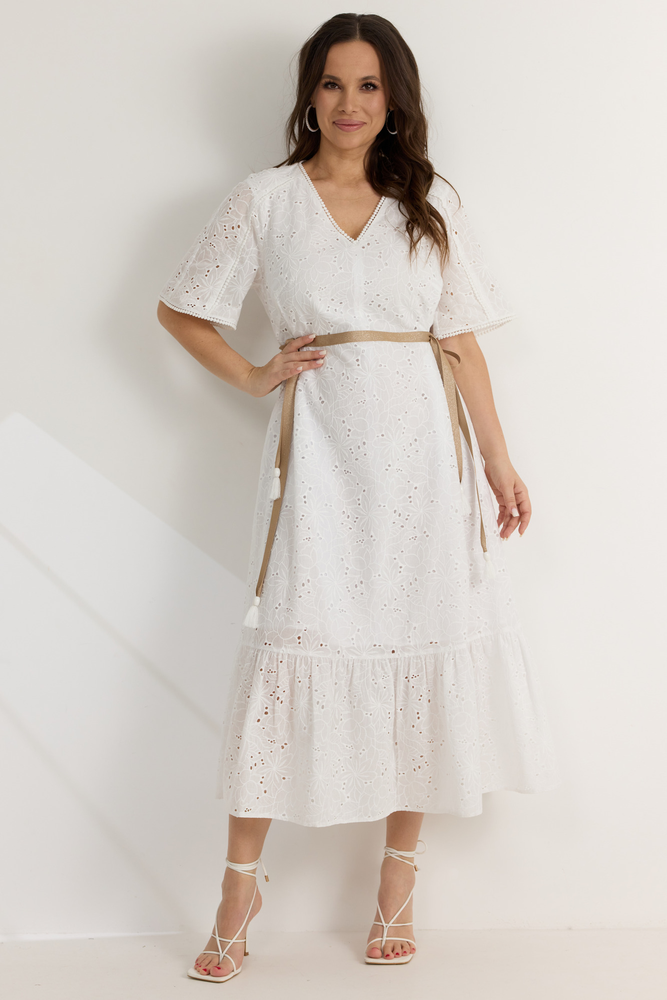 Легкое романтичное платье из натуральной хлопковой ткани. Платья А-образного силуэта с цельнокроеным рукавом, с застежкой по спинке на потайную молнию. Приталено за счет притачной декоративной тесьмы. Горловина с V-образным вырезом. Платье на подкладкке из хлопка. По низу платья притачной волан. По боковым швам платье дополнено карманами. Длина платья от плечевого шва 124см. Длина рукава 29см.
