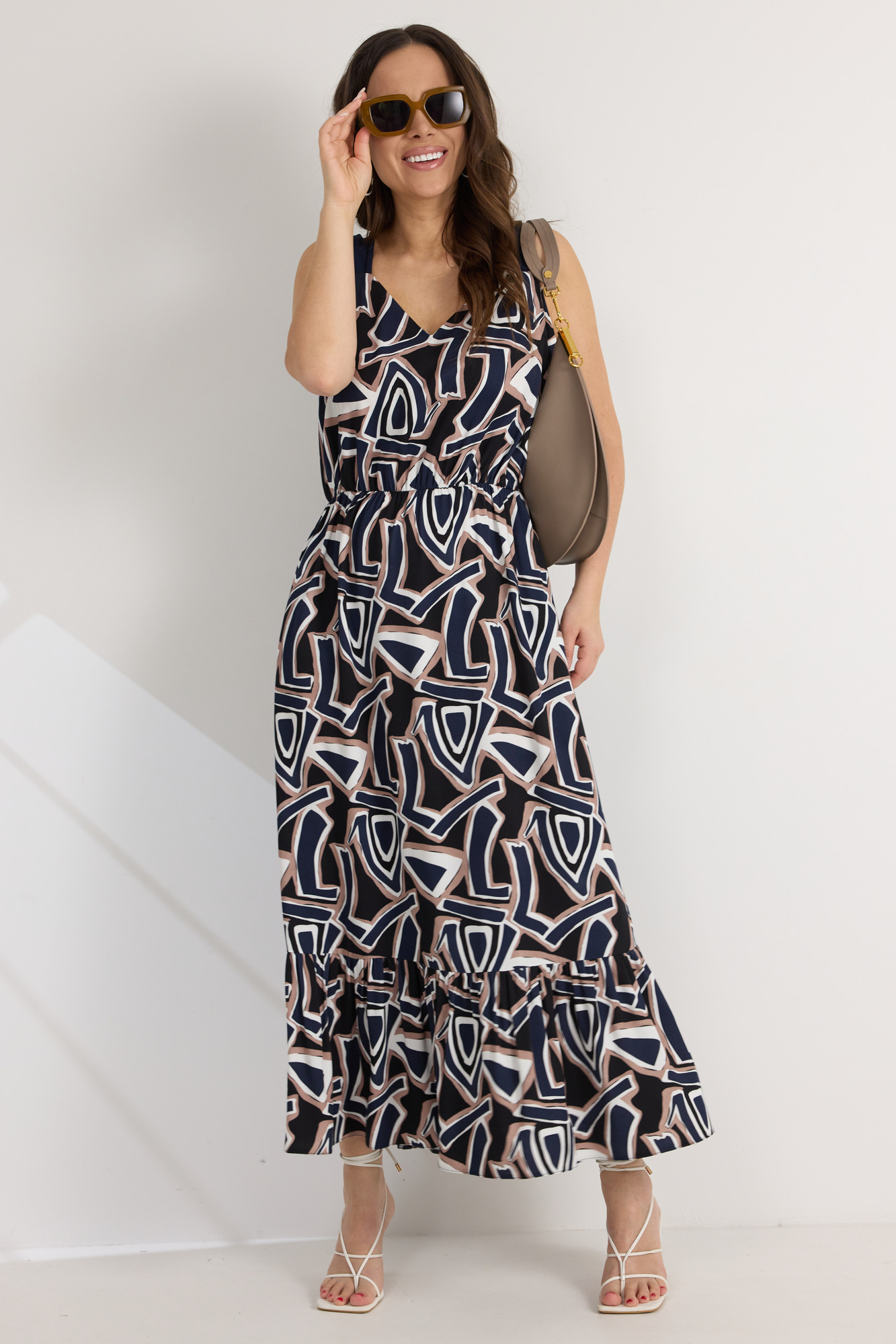 Легкое стильное платье свободного кроя с отрезной талией, дополненной эластичной тесьмой. Горловина с V-образным вырезом. Перед платья выполнен из цветного штапельного полотна, спинка выполнена из однотонного вискозного полотна. По боковым швам платье дополнено карманами. По низу платье дополнено притачным воланом. Длина платья от плечевого шва 138см.