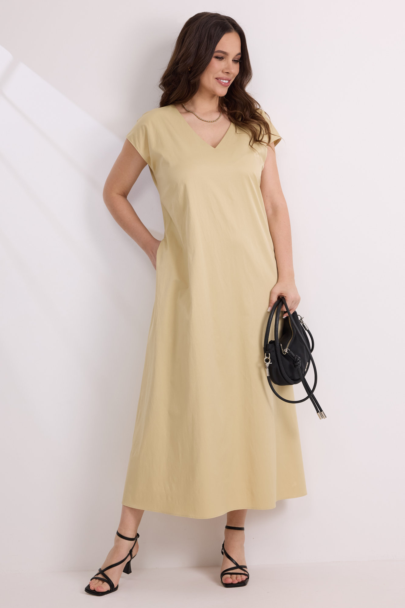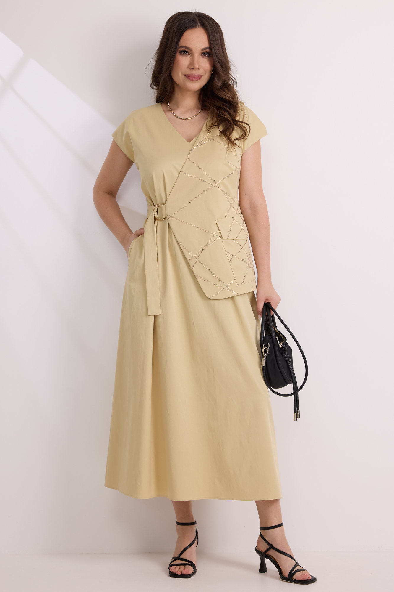 Стильный комплект из платья и полужилета. Платья свободного А-образного силуэта с коротким рукавом. Выполнено из комфортной, держащей форму, ткани. V-образный вырез горловины. По боковым швам полатье дополнено функциональными карманами. Платье дополнено съемным полужилетом. Выполнен из такой же ткани, что и платье, но дополнен пришивными линиями из пайеток. Жилет на одно плечо с застежкой по талии на пришивной пояс с пряжкой. Жилет на подкладке. Длина платья от плечевого шва 132см. Длина рукава 15см. Длина жилета от плечевого шва 67см.